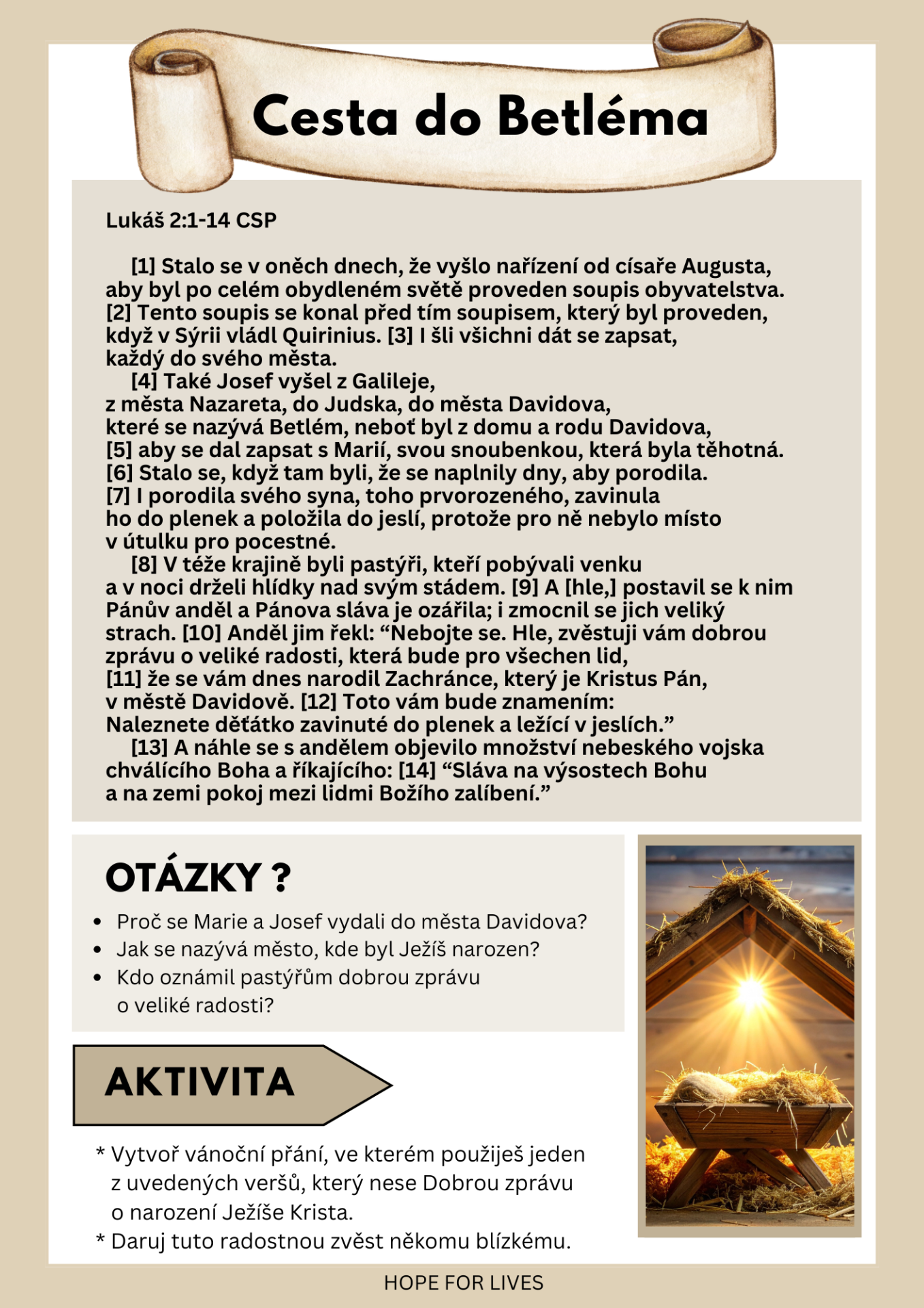 * Biblický příběh s verši, otázkami a aktivitou * Osmisměrka s klíčovými slovy a řešením * Bludiště s veršem * Vyhledávání veršů k příběhu