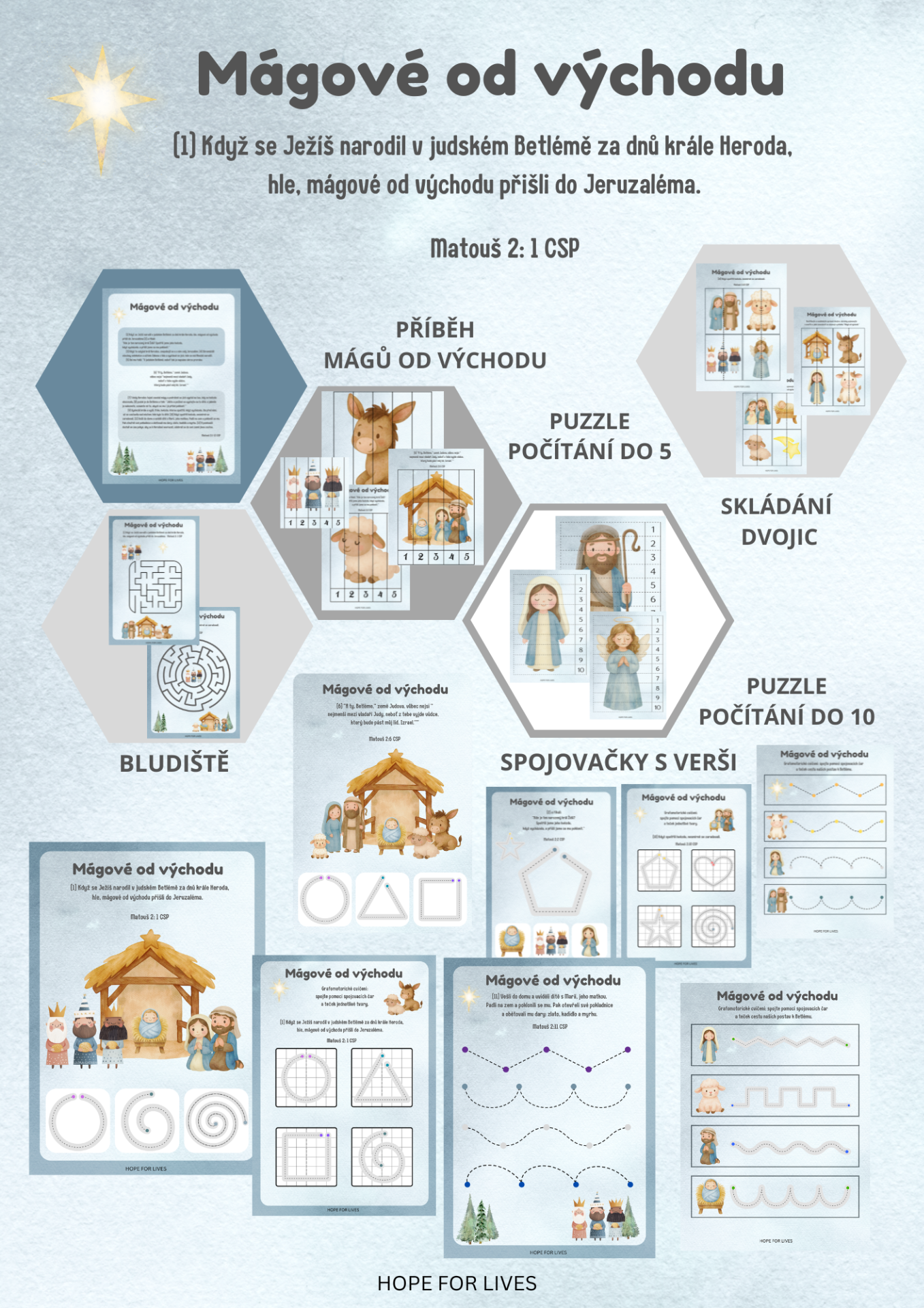 * Biblický příběh s verši * Puzzle a obrázková předloha a karty s počítáním do 10 * Obrázková řada, bludiště * Grafomotorická cvičení * Slabikování slov příběhu * Vyhledávání rozdílu * Domalovánky, spojovačky * Karty s verši * Cesta k Betlému, obrázkový diktát * Hra: "Já mám...ty máš?"