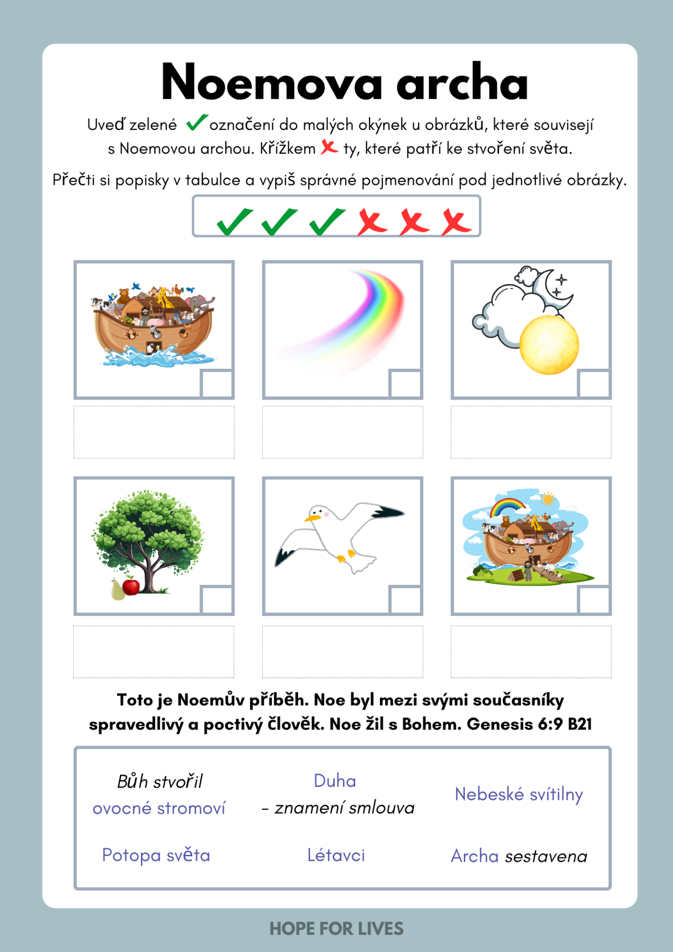Toto je Noemův příběh. Noe byl mezi svými současníky spravedlivý a poctivý člověk. Noe žil s Bohem. (Genesis 6:9 CSP)