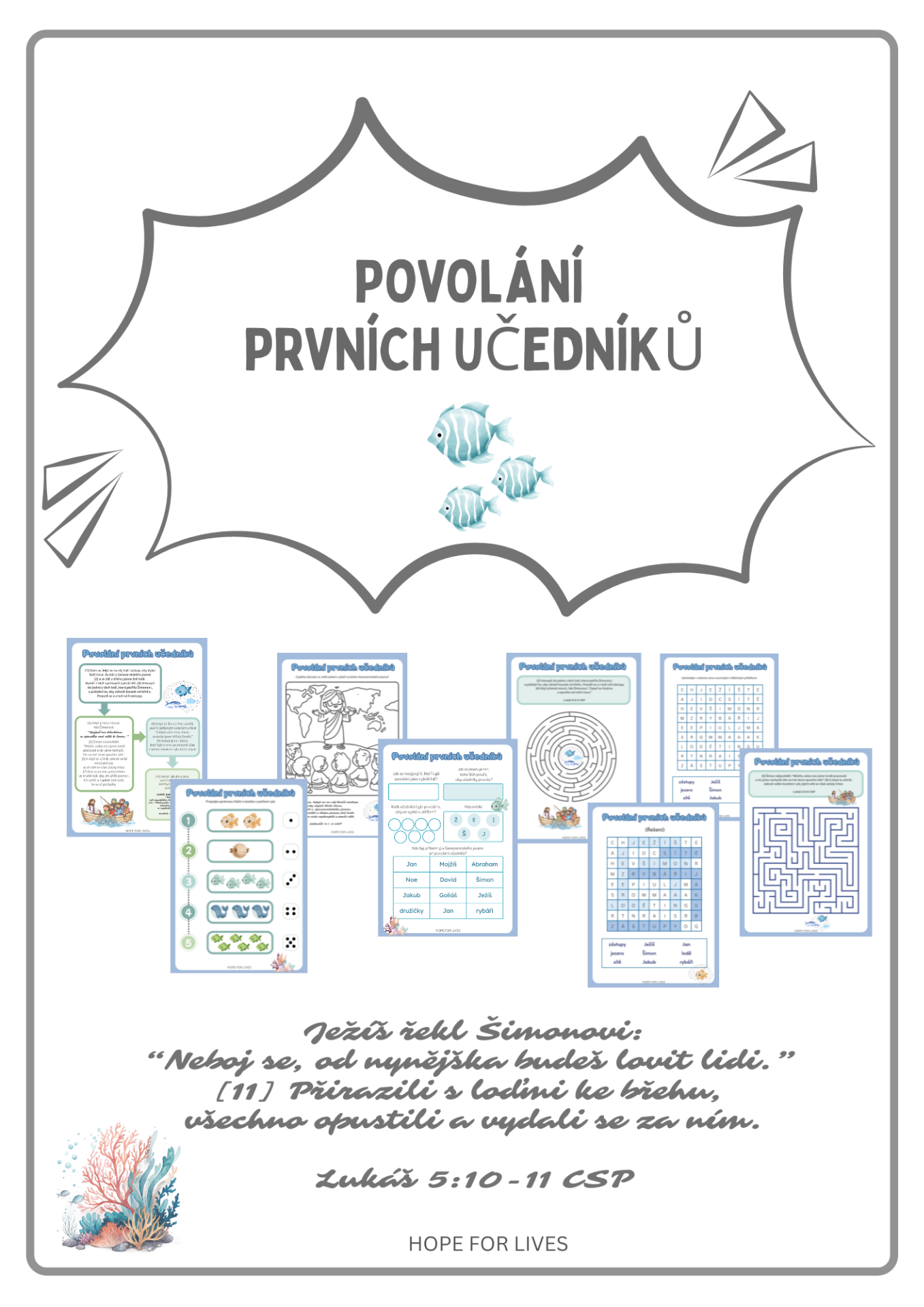 * Biblický příběh Nového zákona * Bludiště a omalovánky s verši * Osmisměrka s klíčovými slovy příběhu a řešením * Obrázková řada a počítání * Tajenka s úkoly pro starší děti