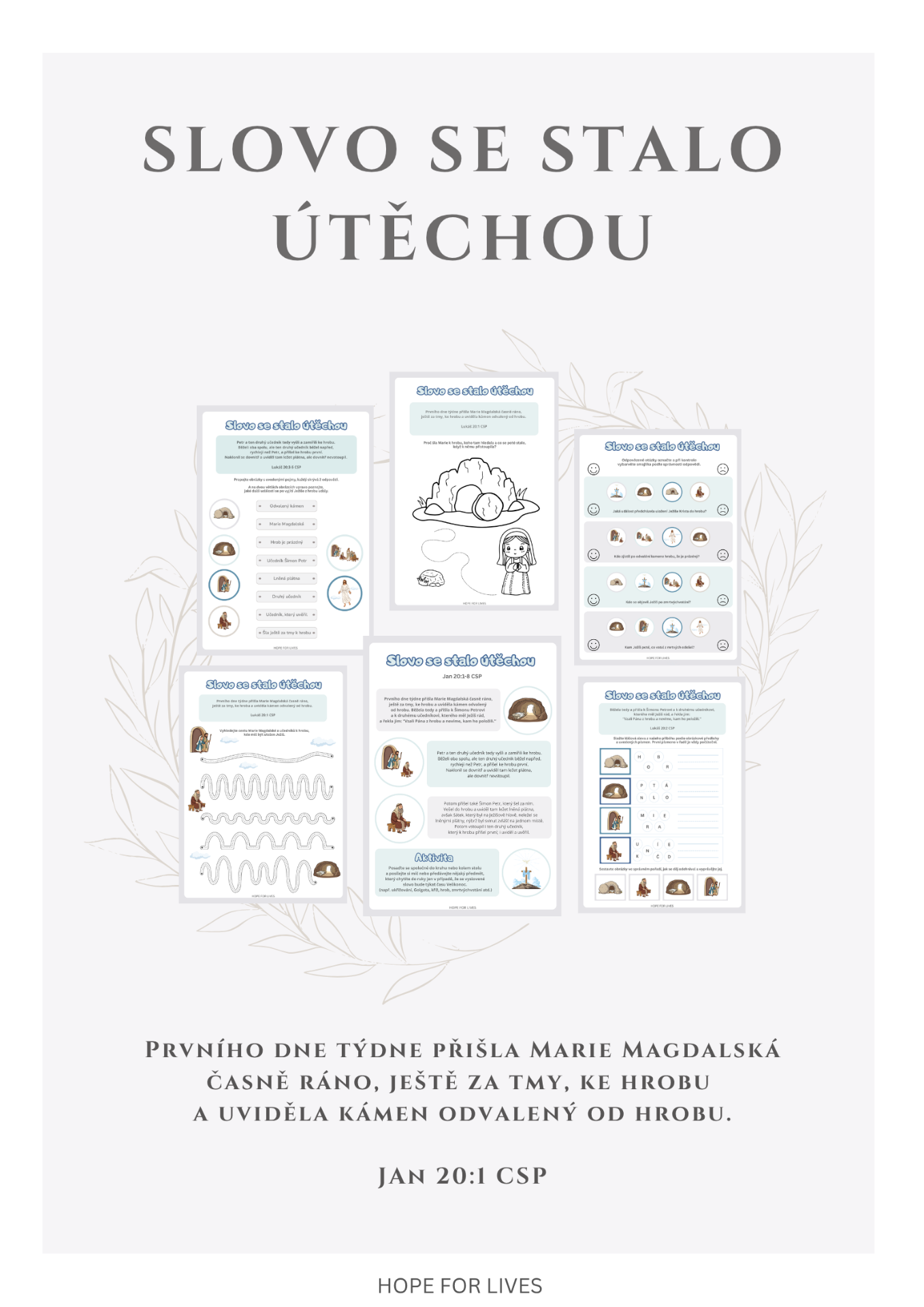 * Biblický příběh s aktivitou * Cesta Marie Magdalské k hrobu * Složte klíčová slova příběhu a sestavte děj podle předlohy * Omalovánky s veršem * Propojování obrázků s pojmenováním * Kvíz s otázkami