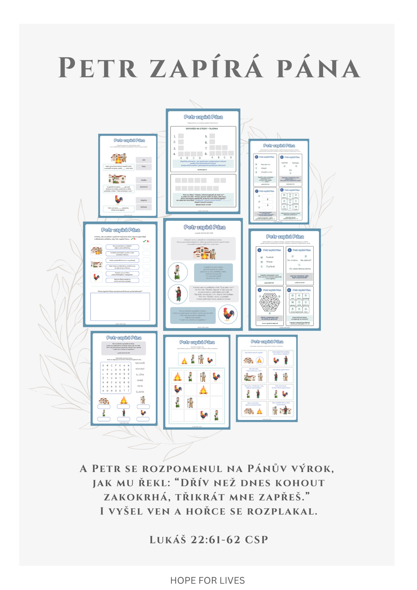 * Biblický příběh Petrova zapření * Obrázková řada * Vyhledání klíčových slov k verši * Určování správnosti slov a rozvaha * Osmisměrka s pojmenováním obrázků příběhu * Vyhledávání odpovědi na otázky podle obrázkové předlohy * Karty s otázkami a tajenkou k biblickému verši